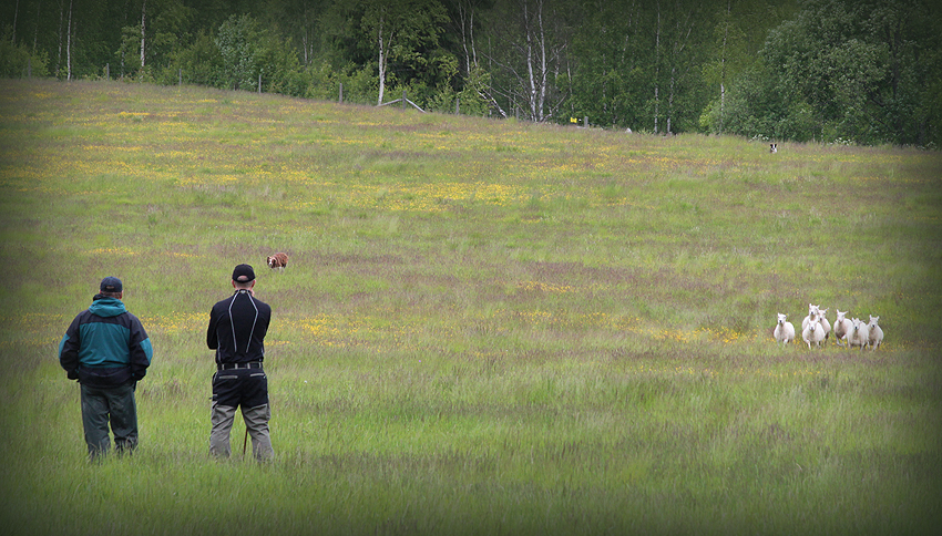 Vi har varit på kurs med Derek vid två tidigare tillfällen och inför årets kurs hade vi tränat Fame lite grann efter hans principer, så när vi kom till första vallningstillfället med Derek och han ville att vi skulle visa hur vi tränade och på vilken nivå hunden för tillfället stod, så gick Danne ut och körde Fame som han brukar. Derek stod brevid och iakttog... När Danne vallat en bra stund och avslutande kom och ställde sig med oss andra och Derek skulle summera vad han sett, så fick de lovord som inga andra...
